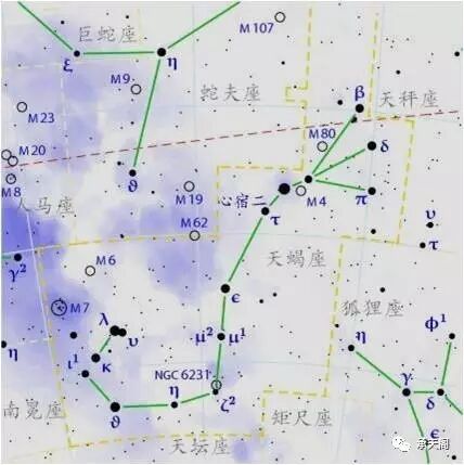 房四星,即西方天蝎座头部的π(pi)、ρ(rho)、δ(delta)、β(beta)四星。天蝎座星图与房宿位置对比图