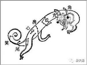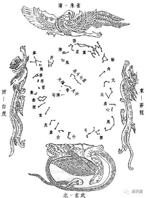 颗恒星的方位,发现了金、木、水、火、土五大行星的运动规律。其体系对后世发展颇有深远影响。《甘石星经》把天空分为东西南北“四宫”,实际上是把天空分为四部,分别以青龙(苍龙)、白虎、朱雀、玄武(一种龟形之神)为名,称之为四象。又把天空中可见的星分成二十八组,叫做“二十八宿”,东西南北四方各七宿。以每部分中的七个主要星宿连线成形,以其形状命名。东方的角、亢、氐、房、心、尾、箕形状如龙,位于东方,属木,色青,总称青龙,又名苍龙;西方七星奎、娄、胃、昴、毕、角、参,形状如虎,称为白虎;南方的井、鬼、柳、星、张、翼、轸联为鸟形,称朱雀;北方七星斗、牛、女、虚、危、室、壁,其形如龟,称玄武。于是,青龙、白虎、朱雀、玄武又成为镇守天宫的四神,辟邪恶、调阴阳。四神之中,青龙与白虎因为体相勇武,主要地被人们当作镇邪的神灵,其形象多出现在宫阙、殿门、城门或墓葬建筑及其器物上,在最后一种场合里,龙已不是助墓主升天,而是镇慑邪魔,保卫墓主的灵魂安宁。东方苍龙七宿之四为房宿。房宿为东方二十八宿之一,计四颗星,四星如马状排列,因古代“龙为天马”, 古人也称之为天驷星(意即四匹天马)。